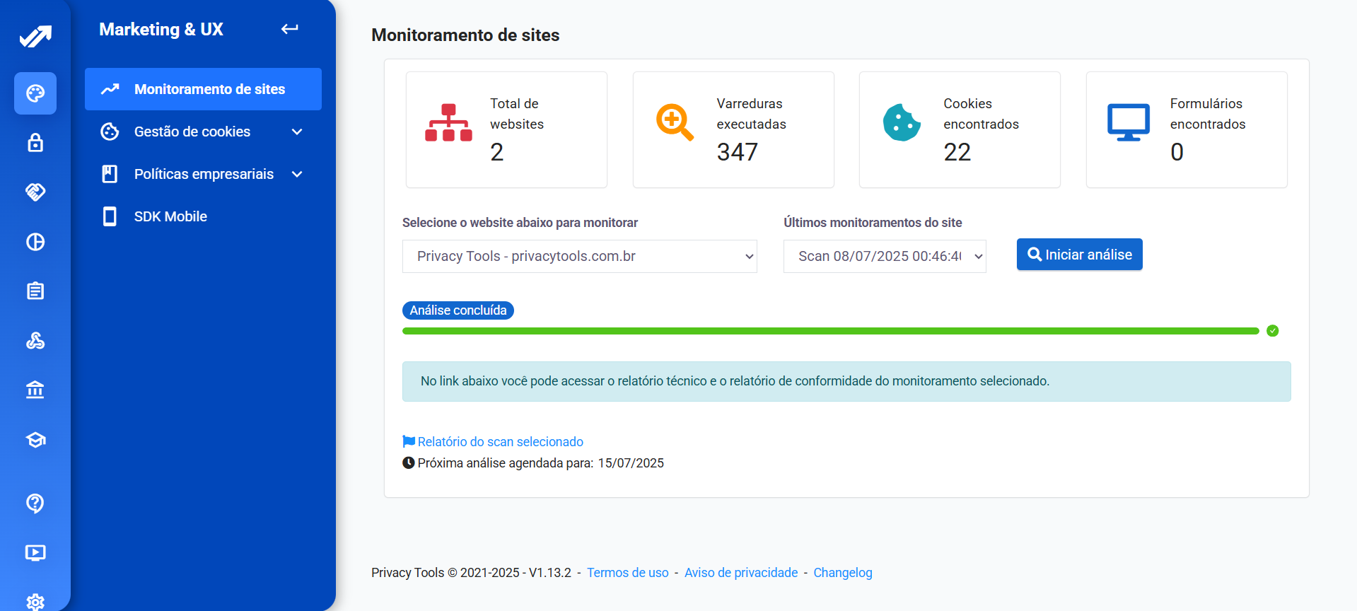 Após cadastrar seus sites, a Privacy Tools realiza varreduras automáticas para identificar cookies e trackers, categorizando-os e gerando relatórios detalhados. Isso ajuda o DPO e a equipe de TI a manter visibilidade sobre os cookies ativos e a aderência aos princípios de minimização e transparência previstos na LGPD e GDPR.