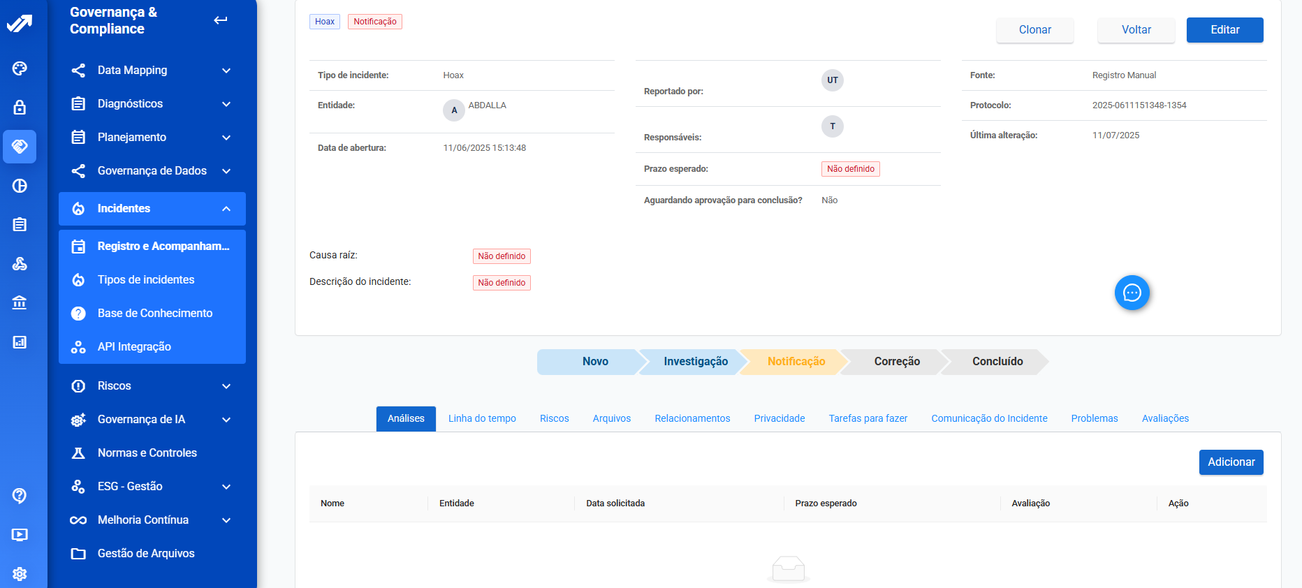 Crie registros com campos personalizados para origem, tipo, impacto, dados afetados e responsáveis, com geração automática de protocolo.