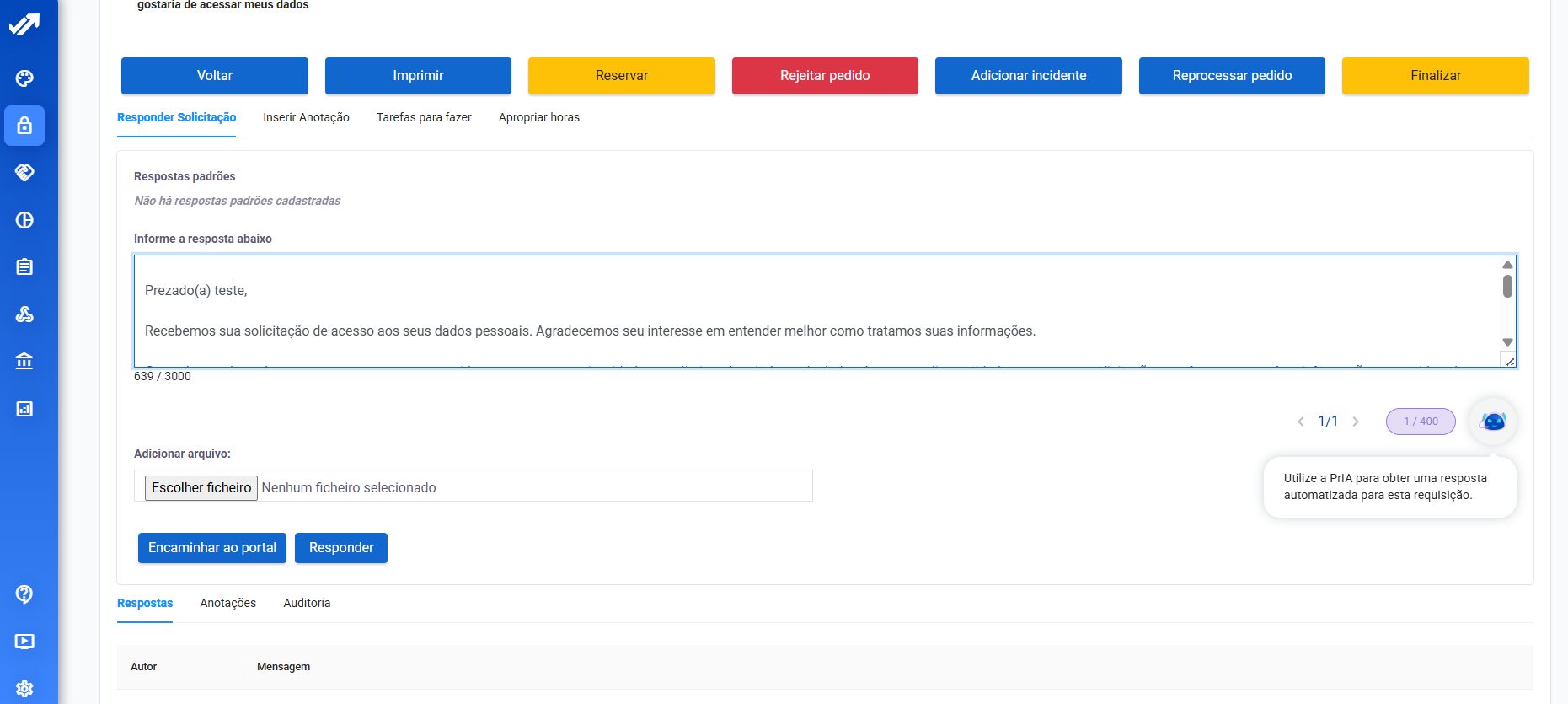 Geração automatizada de registros, atividades e respostas aderentes à LGPD.