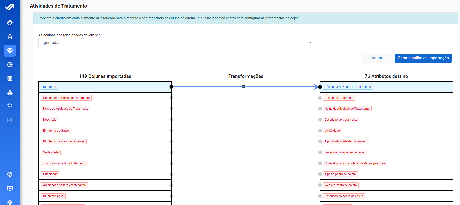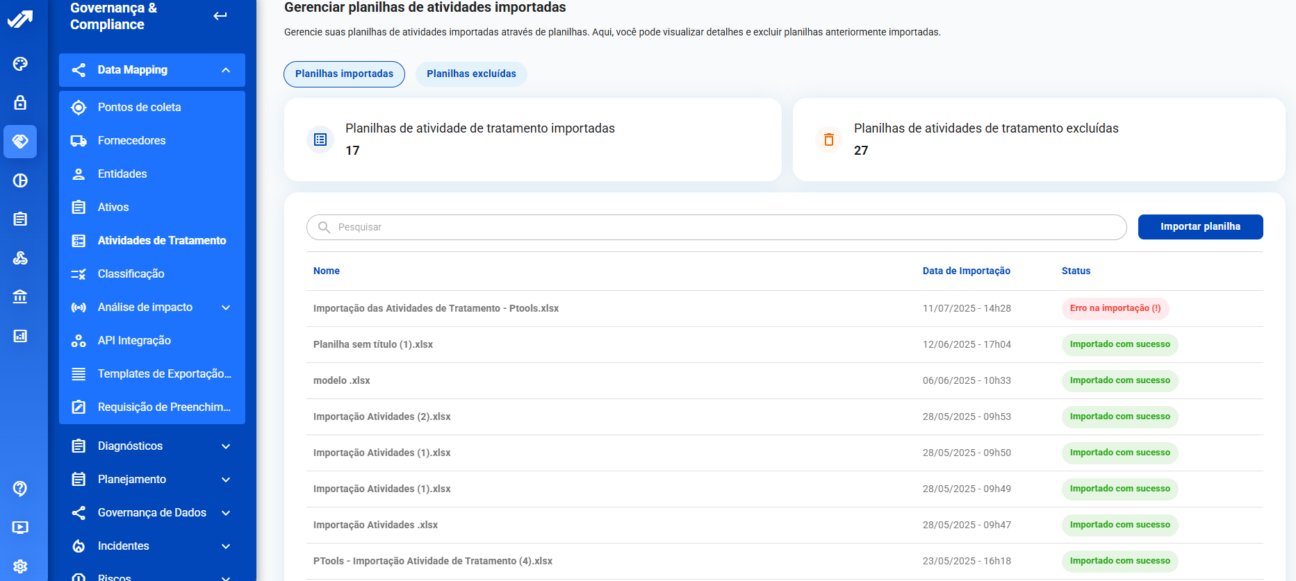 Se você já possui um mapeamento em planilhas, a Privacy Tools permite a importação direta, com validação automática, atualização em massa e compatibilidade com exigências regulatórias.